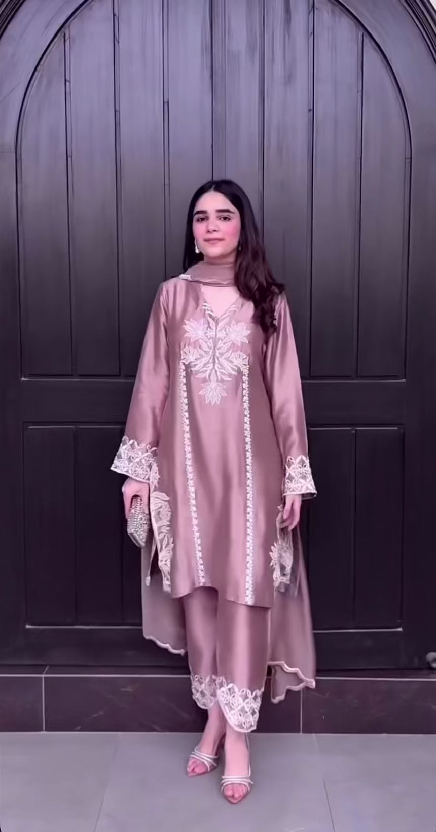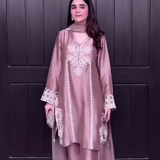 A premium designer Dusty Rose Satin Silk Kurta Set featuring rich white thread embroidery, cutwork sleeves, and a stylish high-low silhouette. Comes with a matching embroidered pant and dupatta — perfect for festive events, family functions & special occasions.