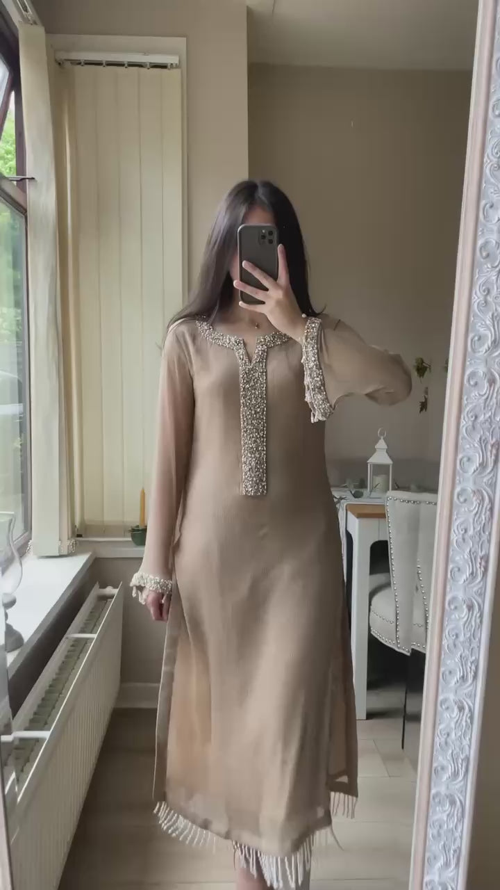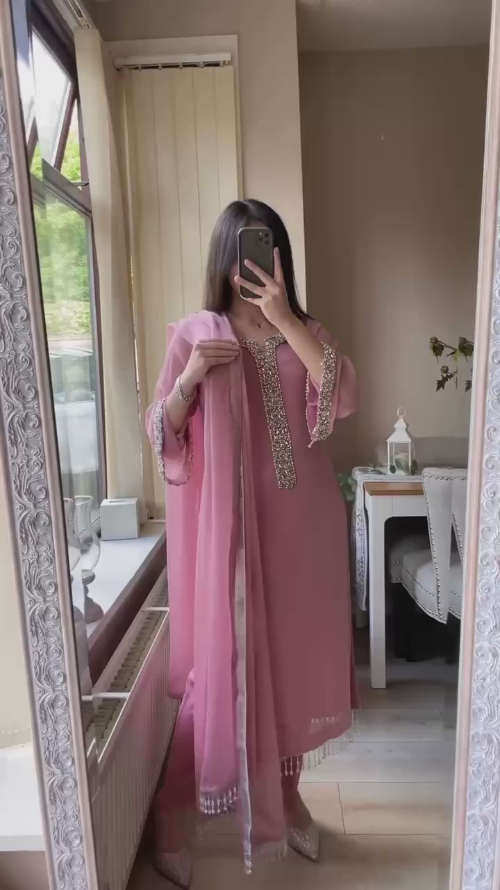 Add elegance to your festive and party wardrobe with this beautiful Kurti Top, Pant & Dupatta set, crafted in premium Faux Georgette fabric and highlighted with real moti hand work and fancy moti lace detailing on sleeves. A perfect combination of grace, comfort, and luxury.