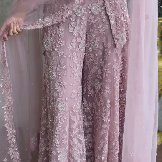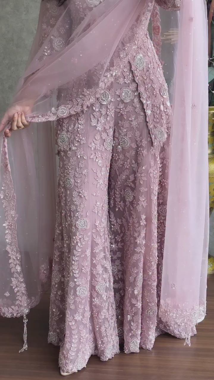 Make a graceful style statement with this premium designer Faux Georgette Top Plazzo Set, beautifully crafted with thread embroidery, sequence work, and rivet moti detailing. Paired with a soft butterfly net dupatta, this outfit is perfect for parties, festive occasions, and wedding functions.