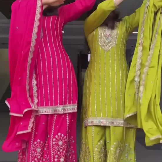 Upgrade your festive wardrobe with our Premium Heavy Chinnon Silk Palazzo Suit Set, beautifully designed with Coding Embroidery, Sequence Work, and Four-Side Lace Dupatta. This fully stitched ready-to-wear outfit offers luxurious comfort with a Micro Cotton inner while giving a stunning festive look.