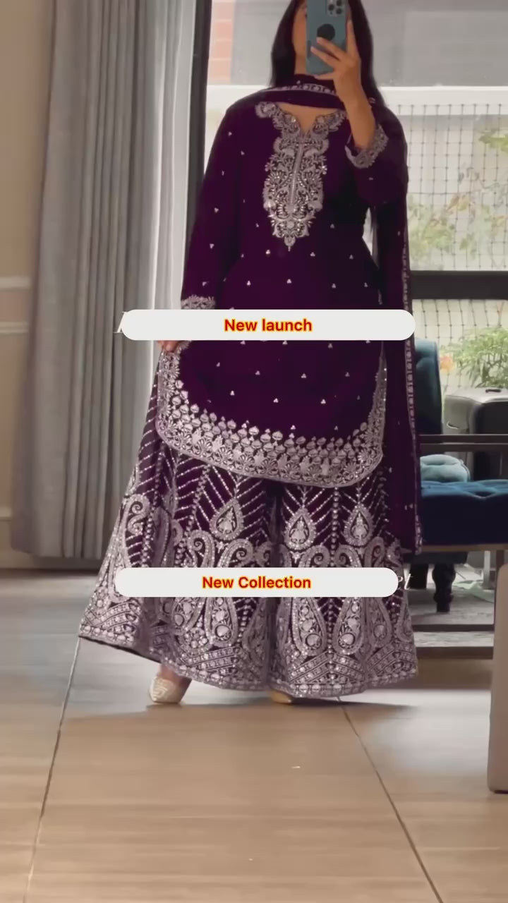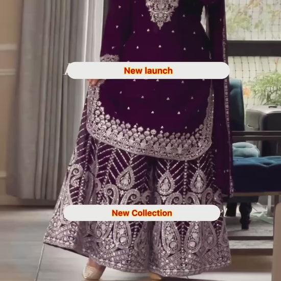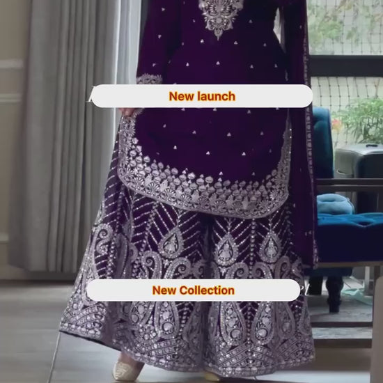 This luxurious 3-piece set includes a fully-stitched top, sharara plazo, and matching dupatta — perfect for weddings, parties, and festive occasions.