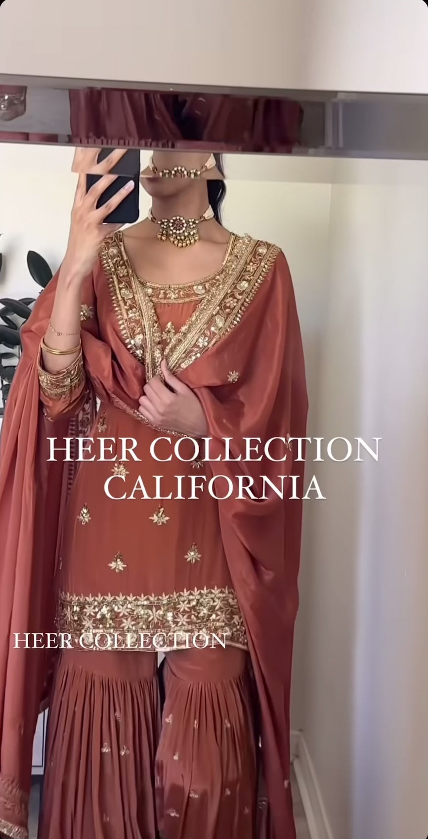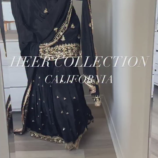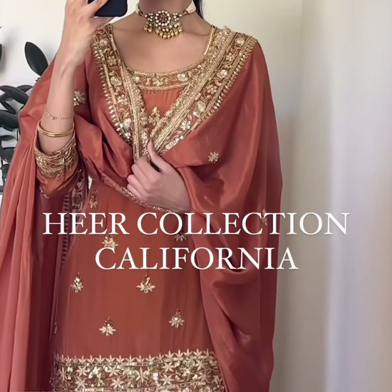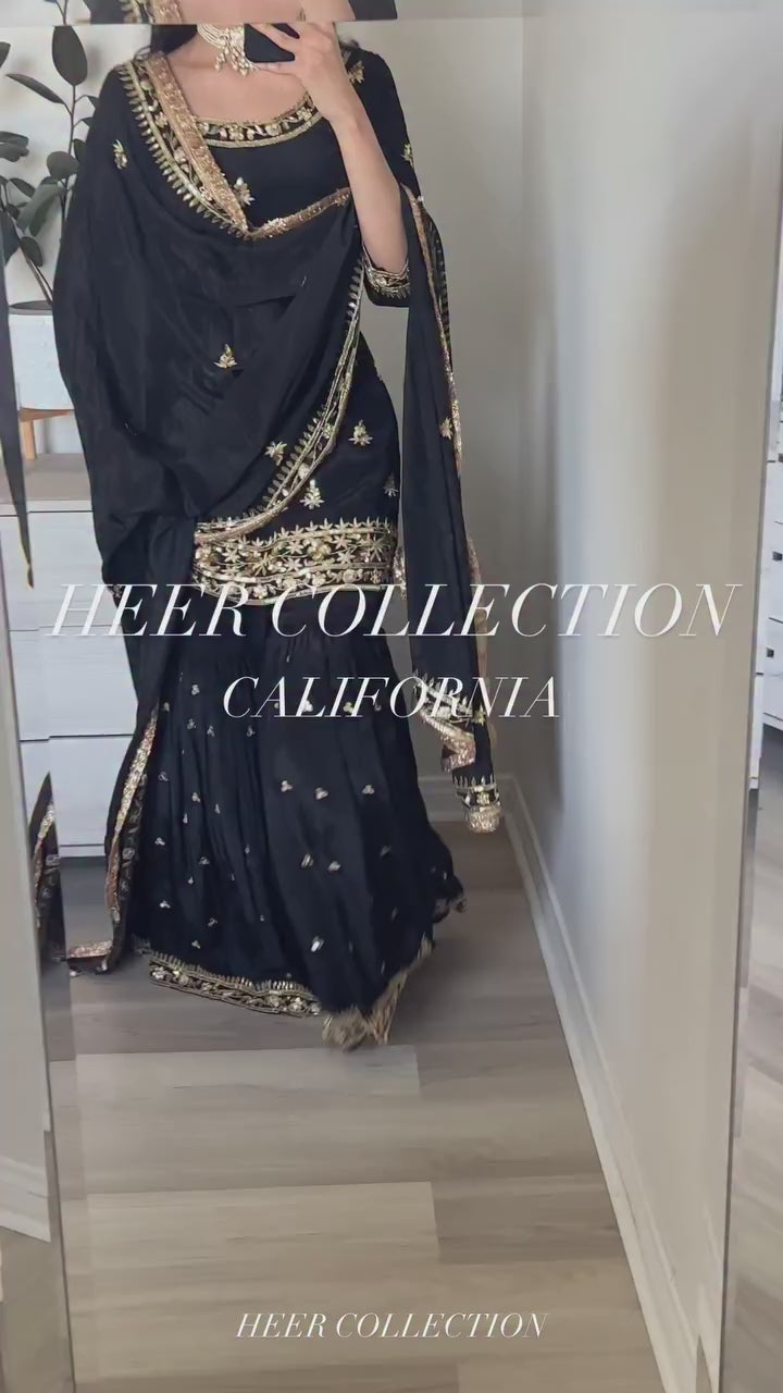 This stunning 3-piece designer outfit is crafted in Heavy Natural Crepe with rich embroidery sequence work, paired with a fully flared sharara-palazzo and a luxurious embroidered faux georgette dupatta. Perfect for weddings, festive functions, and party occasions.