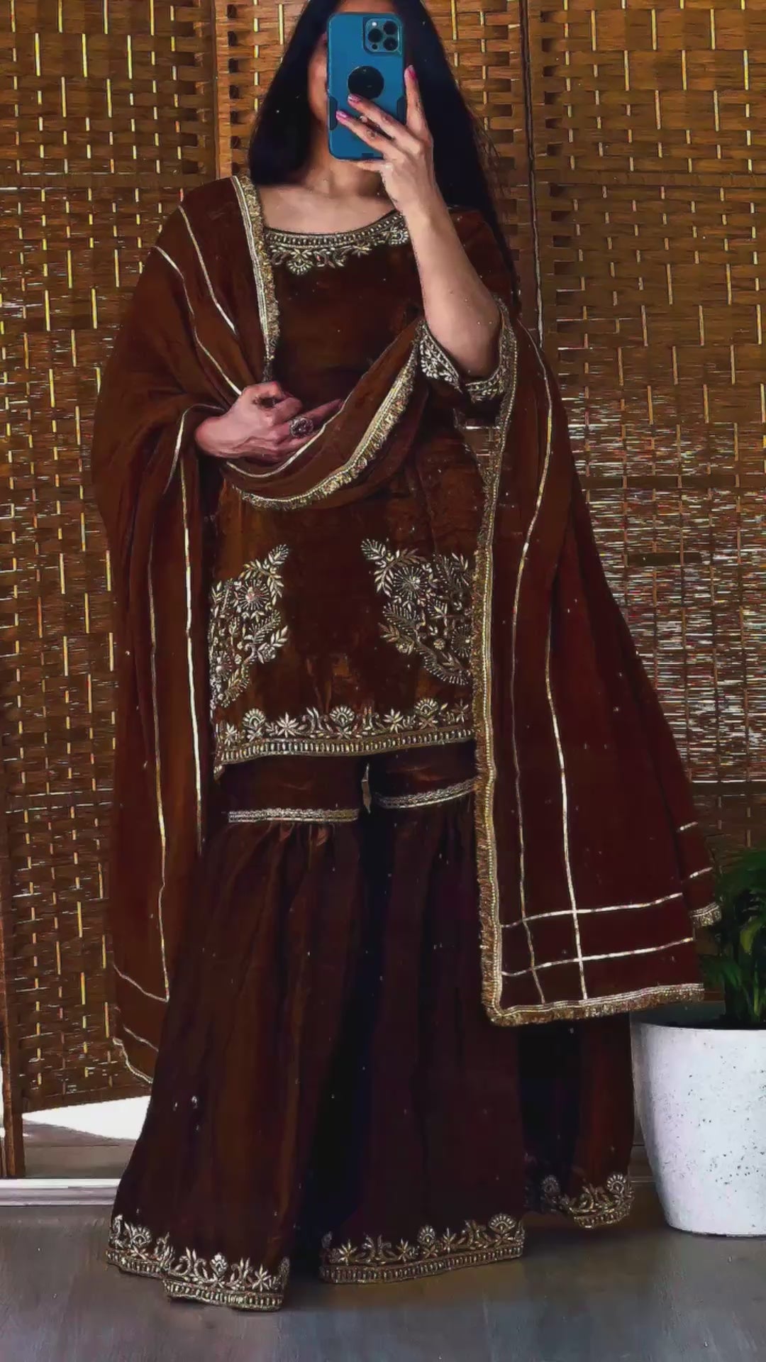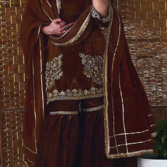 Crafted in a rich chocolate brown shade, this outfit brings a luxurious premium look perfect for weddings, festivals, parties, and special functions.