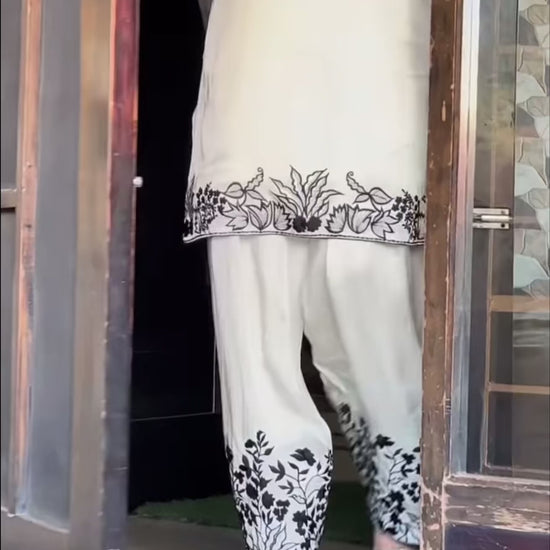Designer White Natural Crepe Silk Suit with Black Embroidery & Farshi Salwar – Party Wear Set with Organza Dupatta