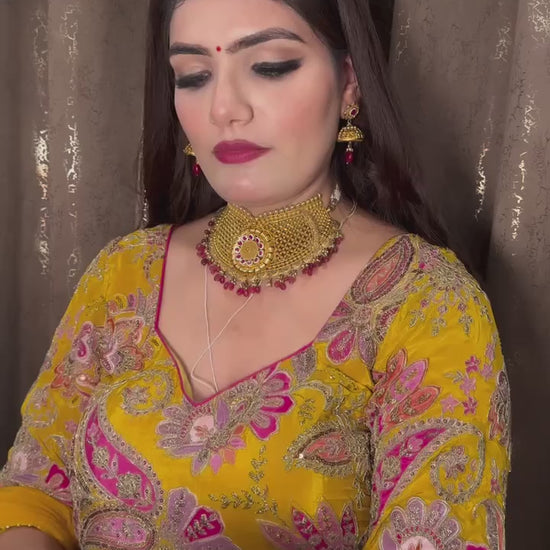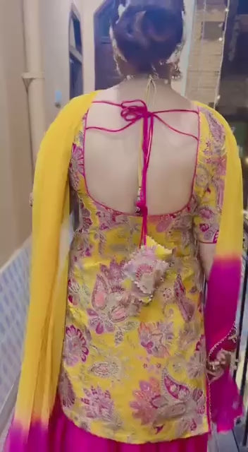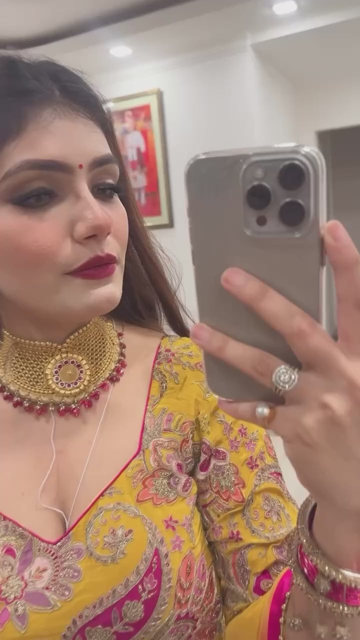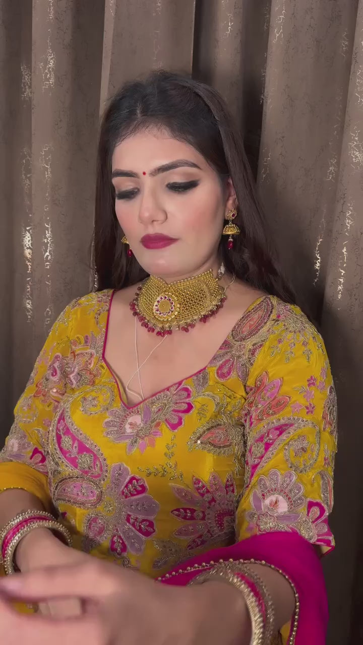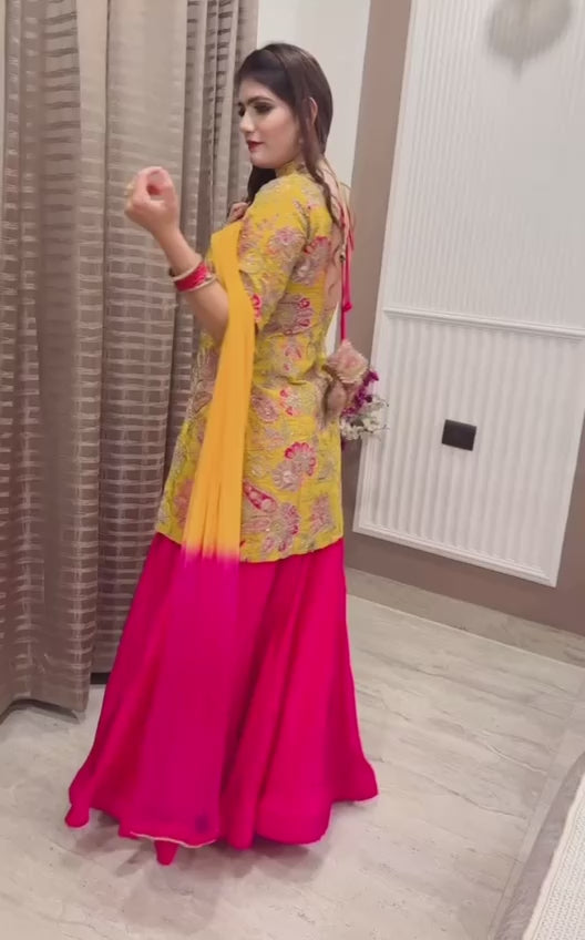Make a vibrant style statement with this Yellow & Pink Designer Top Lehenga Set, crafted in Natural Crepe Silk and Malay Silk for a luxurious and festive look. The outfit features heavy multi-needle embroidery, sequin work, zari detailing, and a beautifully printed georgette dupatta—perfect for weddings, haldi, mehndi, sangeet, and special occasions.