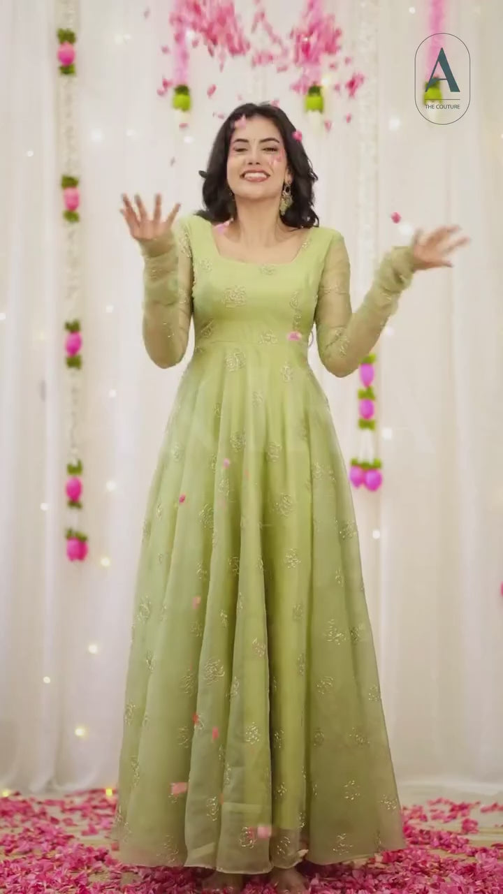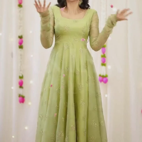 Elegant Pastel Green Embroidered Anarkali Suit With Net Dupatta – Festive & Wedding Wear