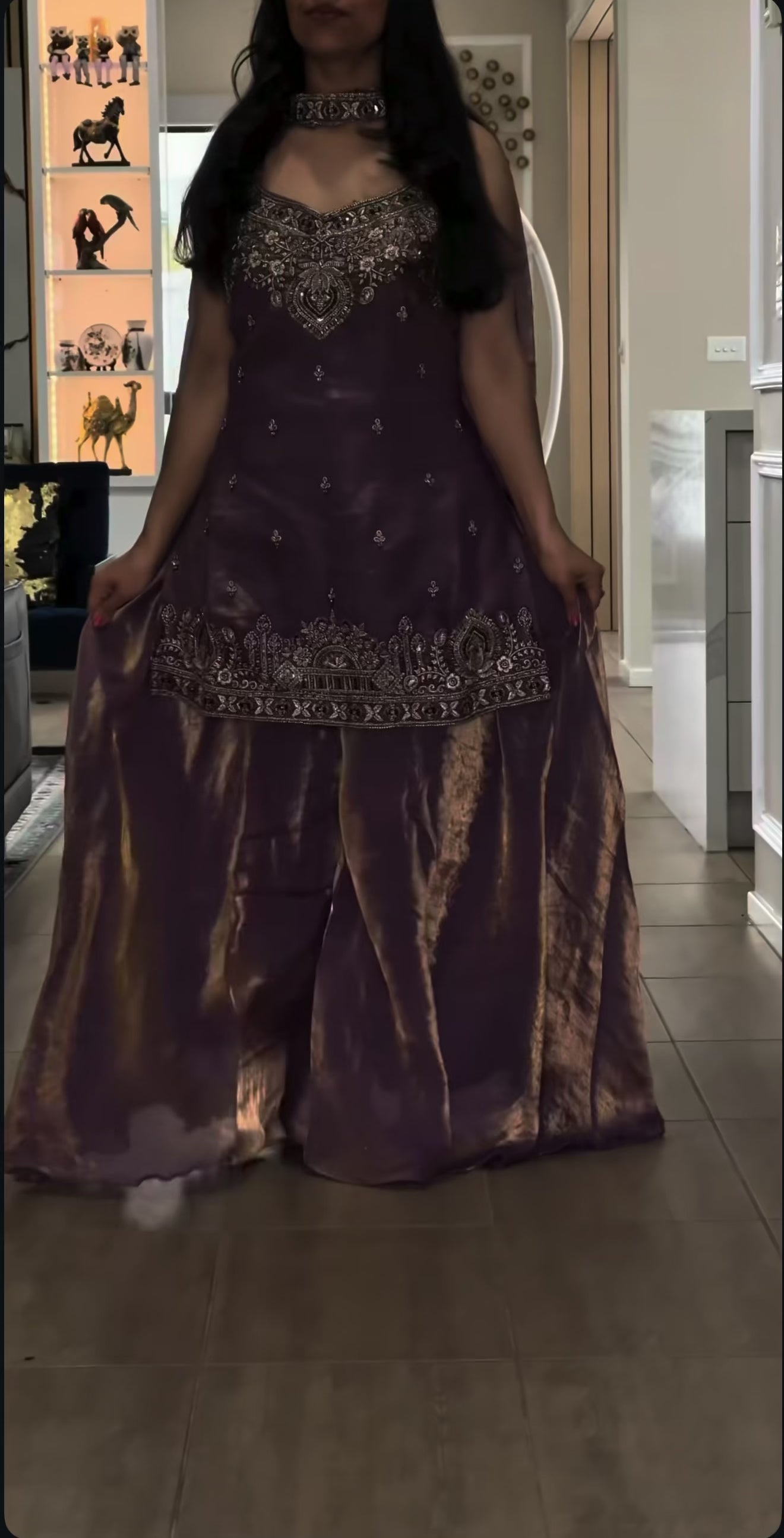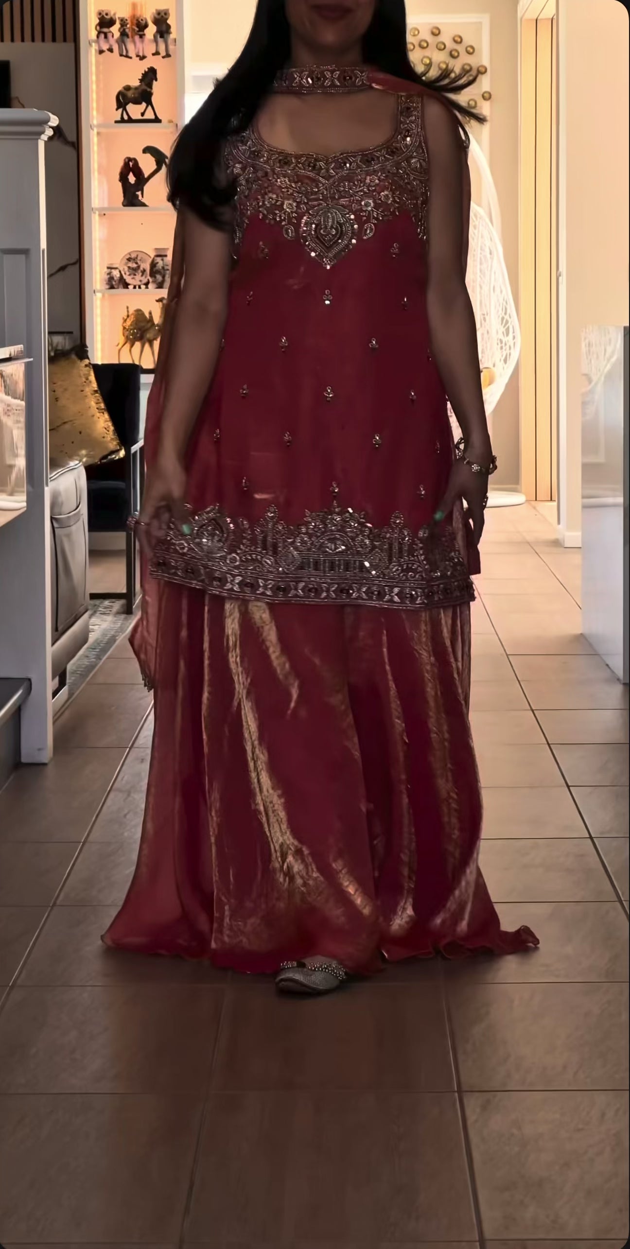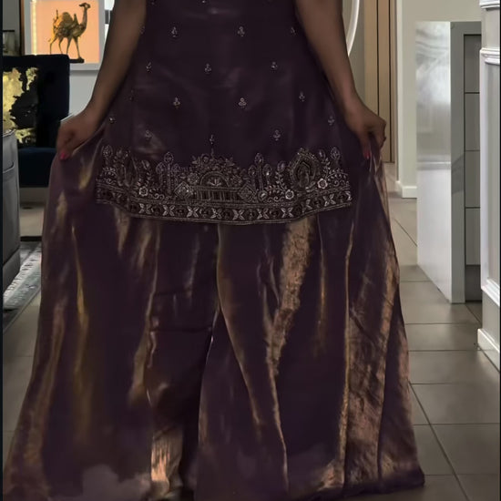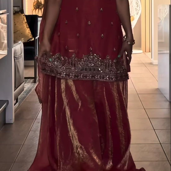 Introducing our Premium Quality Silk Top–Plazzo Set featuring luxurious Pure Frendy Silk fabric enhanced with handwork beads, 3mm sequence embroidery, and fine zari detailing. The stunning umbrella-style plazzo adds a rich flow, and the matching embroidered dupatta completes the perfect festive or wedding-ready look.