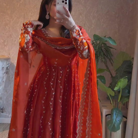 Upgrade your festive wardrobe with this Premium Fendy Silk Anarkali 3-Piece Suit Set, designed for effortless elegance and all-day comfort. Featuring delicate thread and sequence embroidery, a graceful flow, and a rich festive color, this outfit is perfect for celebrations, parties, and elegant daily wear.