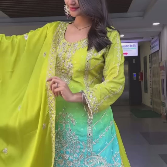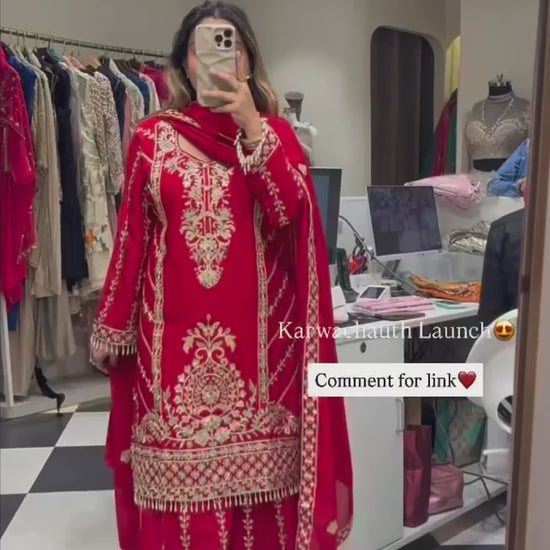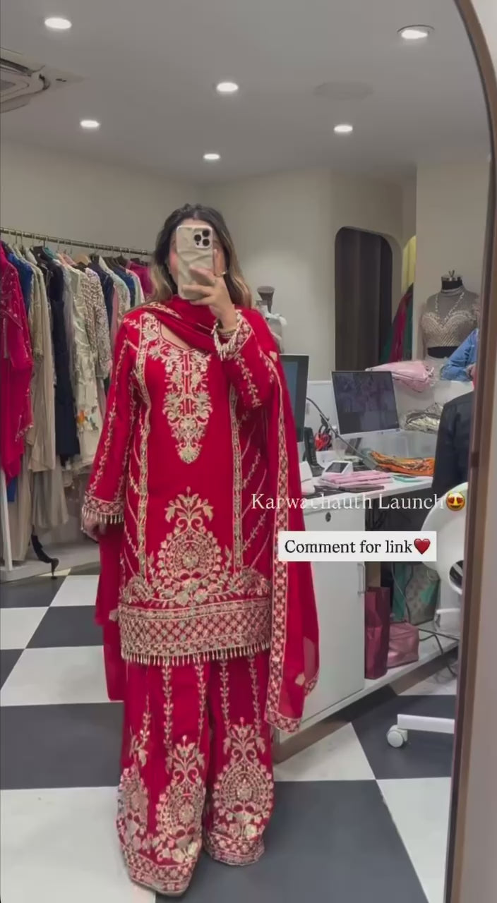 Upgrade your festive wardrobe with this Premium Chinnon Silk Plazzo Set, beautifully designed with Heavy Embroidery Coding Sequence Work.