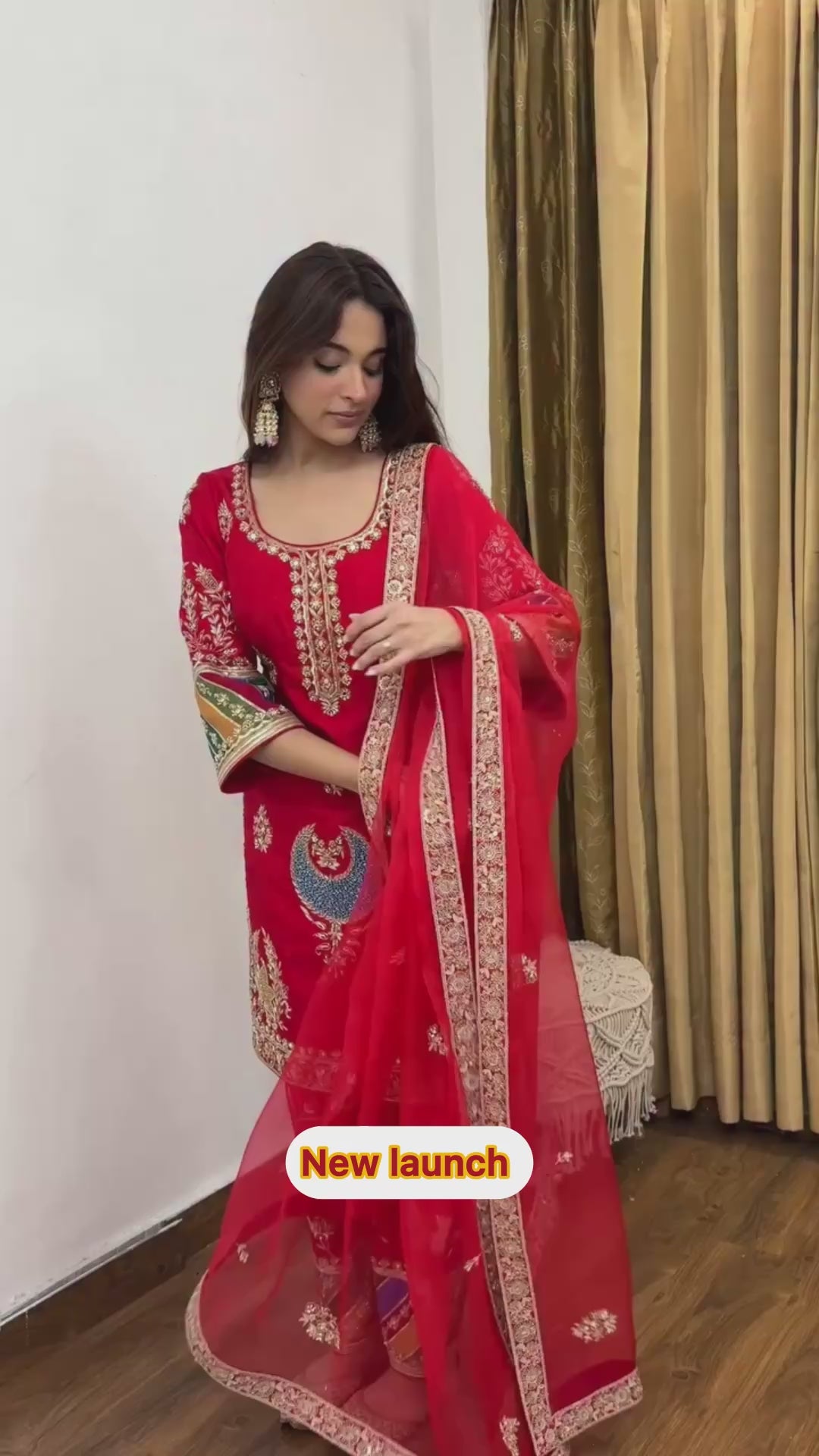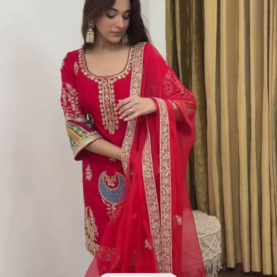 Premium Heavy Crep Silk Embroidered Suit Set with Pant & Net Dupatta | Party Wear