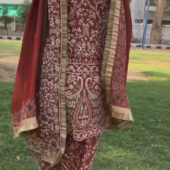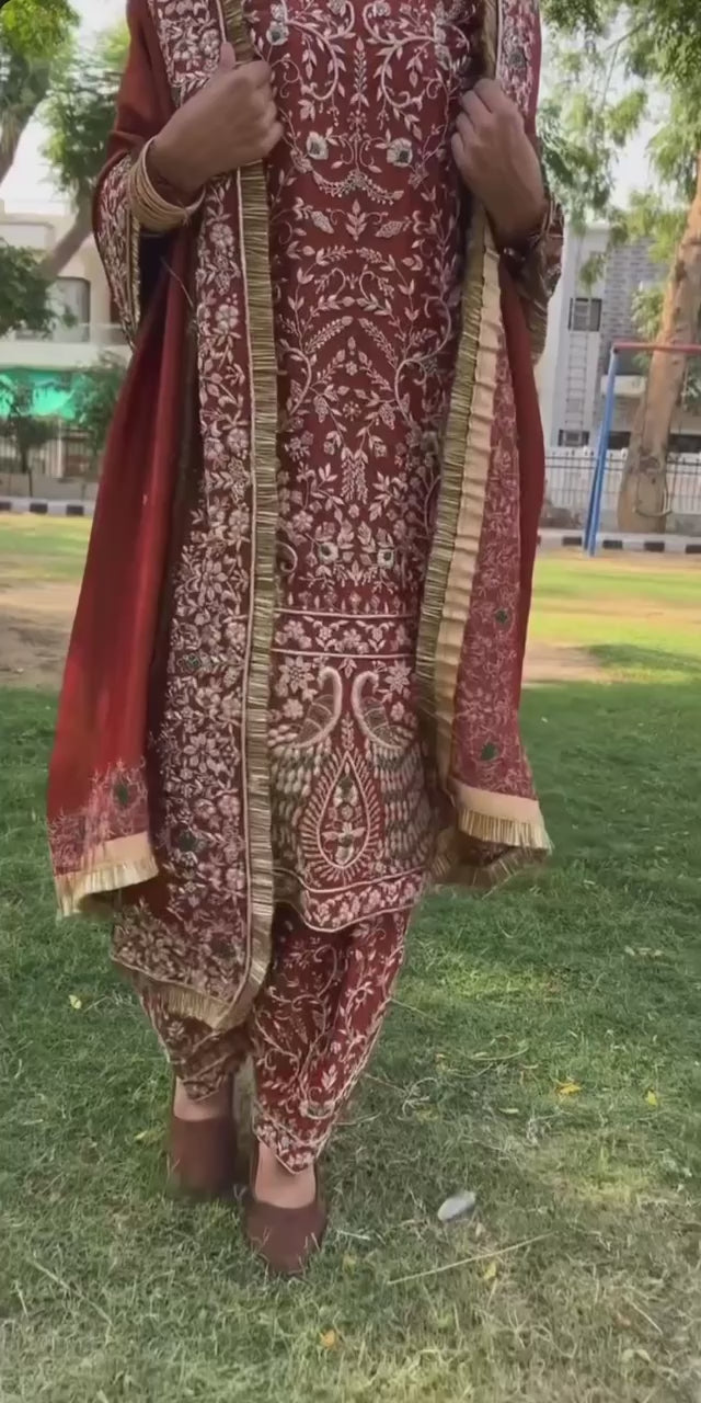 This high-quality three-piece set includes a fully stitched top, Farshi salwar, and a beautiful embroidered dupatta — perfect for weddings, festivals, and royal occasions.