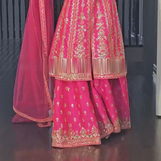Presenting a luxurious Designer Party Wear Top–Sharara Set crafted in Heavy Malay Satin Silk with rich embroidery and sequence detailing. This fully stitched outfit includes a beautifully designed long top, flared sharara plazzo, and an elegant butterfly net dupatta.