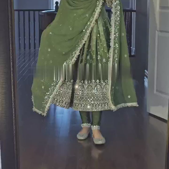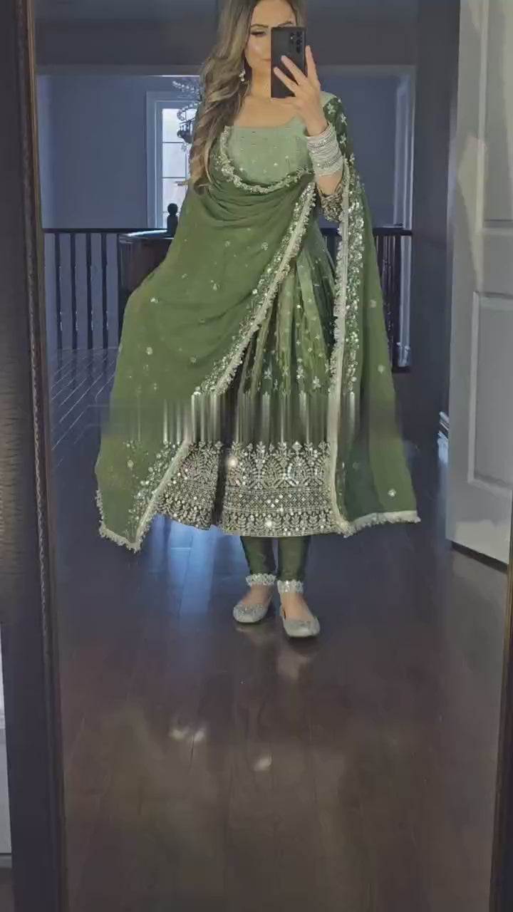 Premium Olive Green Sequence Work Chinon Silk Gown Set with Dupatta | Party Wear Suit